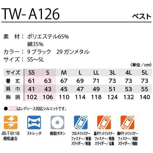 作業服 ベスト ストレッチ タカヤ商事 TAKAYA TW-A126 ブラック 黒 作業着 ユニフォーム 男女兼用 ユニセックス メンズ レディース 通年 秋冬 大きいサイズ JIS規格対応