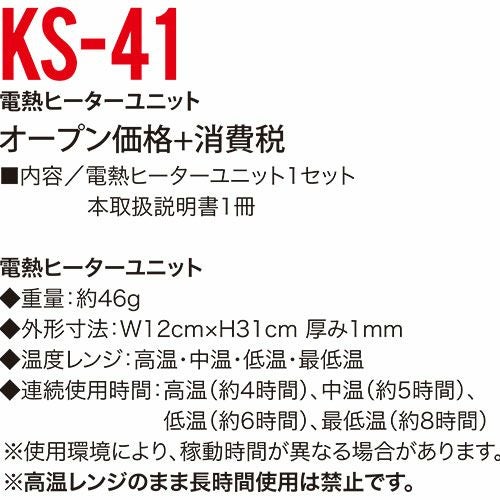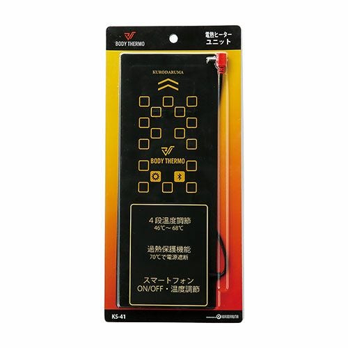 他の画像を見る 電熱ウェア クロダルマ 電熱ヒーターユニット KS-41 作業着 作業服 防寒 暖かい 温度調整可 寒さ 冬対策 特別価格 ¥ 1,617 税込 手動はもちろんスマートフォンのブルートゥース機能でも電源や温度調整などのコントロールが可能!・ワンタッチで取付け簡単・過熱を防ぐ安全装置付きで安心・使用環境に合わせて最適な温度を選べる4段階温度調整機能付き ※使用できる互換バッテリーは以下の通りです。KS-42(電熱ウェア バッテリー・充電セット)KS-32(AIR SENSOR-1 KS-30シリーズ バッテリーセット) カートに入れる お気に入りに登録する