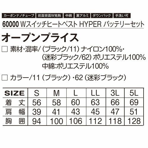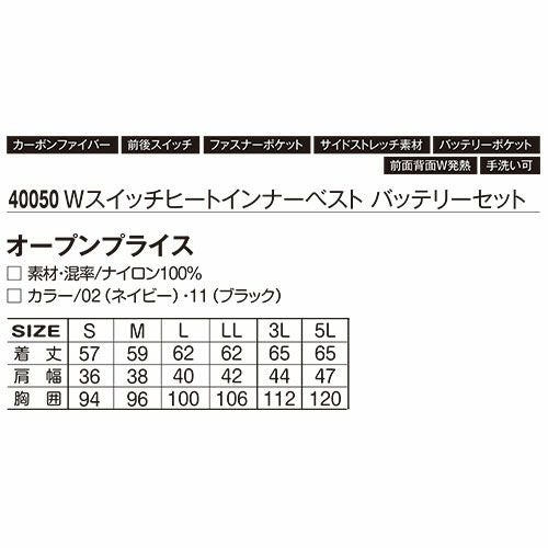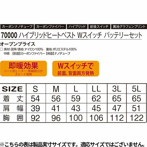 他の画像を見る 電熱ウェア アタックベース ATACK BASE ハイブリッドヒートベスト Wスイッチ【バッテリーセット】 70000 作業着 作業服 防寒 発熱ユニット 発熱体 ヒーター バッテリー付属 ヒートウェア 即暖 暖かい ストレッチ アウトドア スポーツ ゴルフ 釣り キャンプ バイク 通勤 通学 警備 交通整理 特別価格 ¥ 11,301 税込 この1枚で驚きの暖かさ!!高機能素材カーボンナノチューブヒーター採用!!薄くて柔軟性抜群のシート状ヒーター、あたたまりが早く均一に熱が伝わります。 着た瞬間から暖かい高機能発熱体カーボンナノチューブと綿状の発熱体カーボンナファイバーを配したハイブリッドヒートベスト裏地にグラフェンプリントを採用することで熱伝導率を更に高め肩・脇部をストレッチ素材で切り替えることでフィット感を高めた多機能モデル 詳細を見る お気に入りに登録する