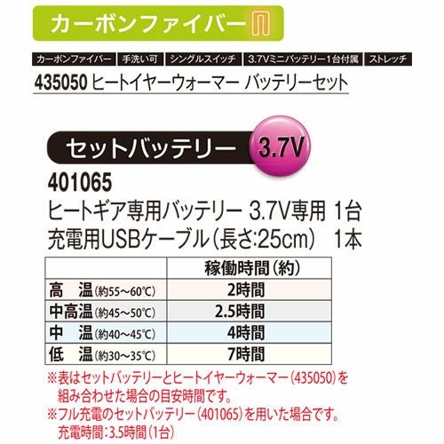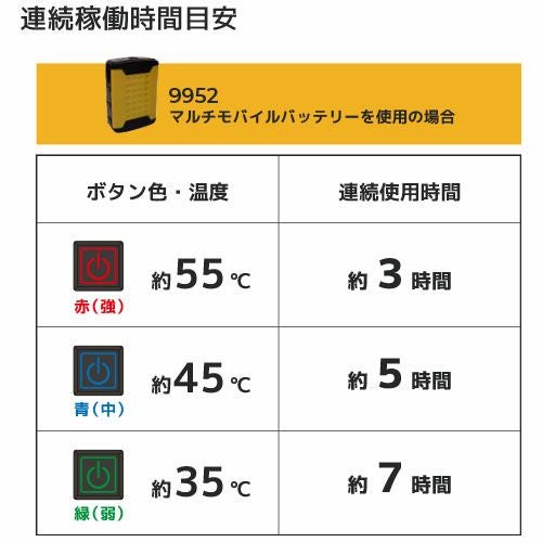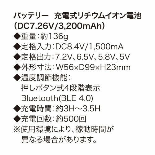 他の画像を見る 電熱ウェアバッテリー シンメン S-HEAT マルチヒーターフルセット SH-100 作業着 作業服 防寒ヒートウェア 作業服 メーカー希望小売価格 ¥ 22,220 特別価格 ¥ 8,558 税込 終日利用可能な専用コンパクトバッテリー付スタンダードキット 「マルチコンパクトヒートパッド」熱伝導率、遠赤外線変換率、省エネ性能に優れた先端素材を使用した2枚の専用パッドを使用「1分でできる簡単な取付」シンプルな構造で初回でも1分程度でモジュールの取付けが可能。充電時もバッテリーからスイッチを外すだけ「コードバインダー」サイズ毎に余りが出るコードをボタン付バインダーを使い脇下にコンパクトにまとめることが可能。着用時の違和感や他のものとの干渉を軽減「専用軽量バッテリー」省エネだからこそバッテリーもコンパクト。軽量バッテリーでも日中十分に温感が持続「驚異のスピード加熱」気づいたら暖かいではなく温感を実感できる温度までパッドを短時間で加熱「衿裏パッドポケット」温感が感じやすい首裏がダイレクトに温まる場所にパッドポケットを配置し着た瞬間に温かさを実感できる構造「適温をキープするインバータ機能」体が温感を感じた後は心地よい温度まで自動で設定温度を下げ最適な温感を安定的にキープ「体の芯まで暖かく」優れた遠赤外線変換により体の奥で体内から発する遠赤外線と摩擦することでコンパクトなパッドでも体全体に温度が波及 カートに入れる お気に入りに登録する