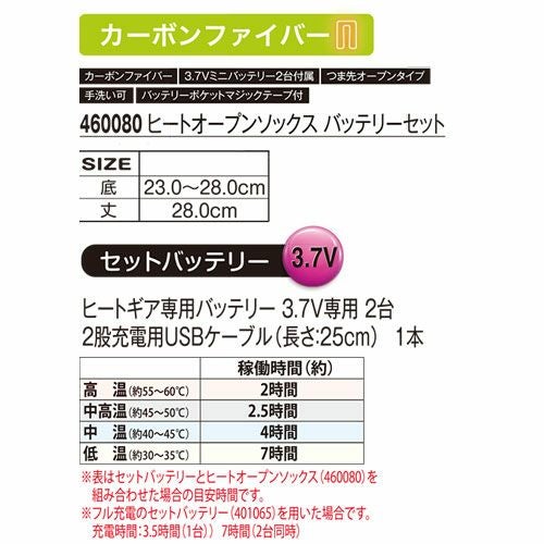 他の画像を見る 電熱ウェア アタックベース ATACK BASE ヒートオープンソックス(左右1セット) バッテリーセット 460080 作業着 作業服 防寒 カーボンファイバー 冷え性 足先 つま先 発熱 熱伝導 暖かい アウトドア スポーツ 登山 キャンプ トレッキング ゴルフ 釣り フィッシング 通勤 通学 バイク 自転車 特別価格 ¥ 8,573 税込 暖かくて嵩張らない安定安心品質のバリエーションモデル 詳細を見る お気に入りに登録する