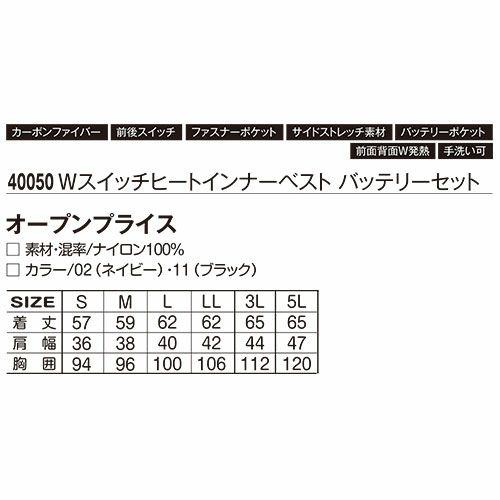 他の画像を見る 電熱ウェア アタックベース ATACK BASE ヒートインナーベスト バッテリーセット 40050 作業着 作業服 防寒ヒートウェア 作業服 特別価格 ¥ 9,361 税込 この1枚でで驚きの暖かさ!!即暖効果首後部と背中に繊維状のしなやかなマイクロカーボンファイバーヒーターを使用装着時の違和感もなく約20秒で首と背中を暖かく包み込んでくれます。スイッチを押すだけの簡単操作 スイッチ付けて20秒でぽっかぽかWスイッチを内側に配し着合わせに響きにくい深いV首ラインを採用し重ね着仕様のインナーヒートベスト 詳細を見る お気に入りに登録する