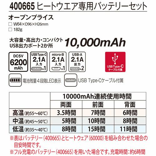 他の画像を見る 電熱ウェアバッテリー アタックベース ATACK BASE ヒートウェア専用バッテリーセット 400665 作業着 作業服 防寒ヒートウェア 作業服 特別価格 ¥ 3,212 税込 大容量・高出力・コンパクト・USB出力ポート2か所 10000mAhUSB Type-Cケーブル付属 カートに入れる お気に入りに登録する