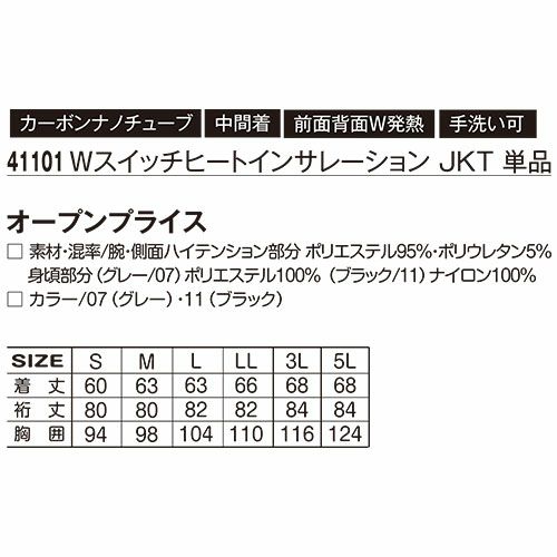 他の画像を見る 電熱ウェア アタックベース ATACK BASE ヒートインサレーションジャケット(単体) 41101 作業着 作業服 防寒ヒートウェア 作業服 特別価格 ¥ 9,625 税込 この1枚で驚きの暖かさ!!高機能素材カーボンナノチューブヒーター採用!即暖効果暖かくて柔軟性抜群のシート状ヒーター、あたたまりが早く均一の熱が伝わります。スイッチを押すだけの簡単操作 電熱の力で圧倒的な速暖力を付加することでレイヤリング時も着膨れないスマートで暖かいヒートレイヤージャケット耐久性や速暖性に優れた高機能カーボンナノチューブを採用したウェアラブルヒータージャケット 詳細を見る お気に入りに登録する