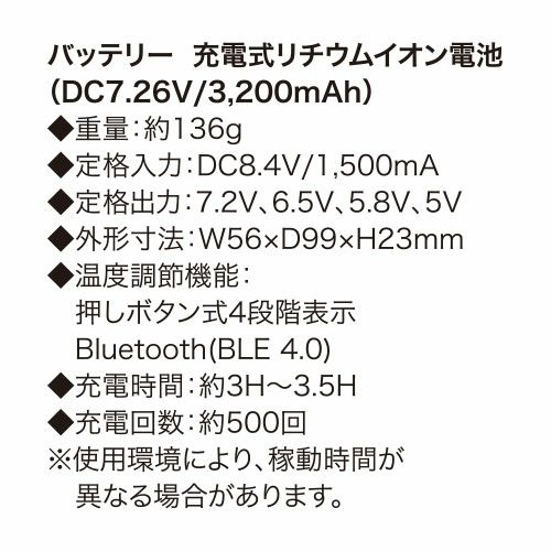 他の画像を見る 電熱ウェア シンメン S-HEAT ストレッチキルトインナー【バッテリー別売】 06152 作業着 作業服 防寒 軽量 ストレッチ 保温 つなぎ ツナギ 特別価格 ¥ 3,430 税込 〜 特別価格 ¥ 税込 動きやすさなどの基本スペックを土台に新たにヒーター対応することで寒い作業現場やアウトドアシーンでさらに活躍する進化系キルトインナー 「マルチコンパクトヒートパッド」熱伝導率、遠赤外線変換率、省エネ性能に優れた先端素材を使用した2枚の専用パッドを使用「1分でできる簡単な取付」シンプルな構造で初回でも1分程度でモジュールの取付けが可能。充電時もバッテリーからスイッチを外すだけ「コードバインダー」サイズ毎に余りが出るコードをボタン付バインダーを使い脇下にコンパクトにまとめることが可能。着用時の違和感や他のものとの干渉を軽減「専用軽量バッテリー」省エネだからこそバッテリーもコンパクト。軽量バッテリーでも日中十分に温感が持続「驚異のスピード加熱」気づいたら暖かいではなく温感を実感できる温度までパッドを短時間で加熱「衿裏パッドポケット」温感が感じやすい首裏がダイレクトに温まる場所にパッドポケットを配置し着た瞬間に温かさを実感できる構造「適温をキープするインバータ機能」体が温感を感じた後は心地よい温度まで自動で設定温度を下げ最適な温感を安定的にキープ「体の芯まで暖かく」優れた遠赤外線変換により体の奥で体内から発する遠赤外線と摩擦することでコンパクトなパッドでも体全体に温度が波及 詳細を見る お気に入りに登録する