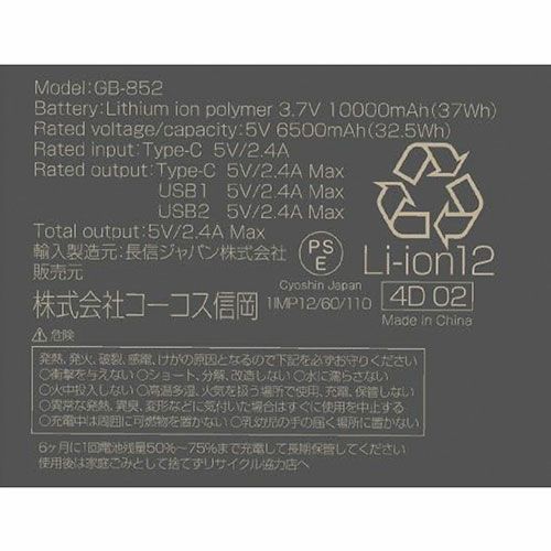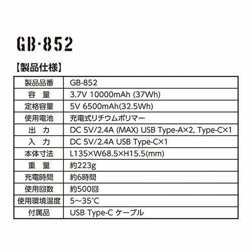 他の画像を見る 電熱ウェアバッテリー コーコス信岡 CO-COS モバイルバッテリー 10000mAh GB-852 大容量 10,000mAh 充電式リチウムポリマー スマホ 電子タバコ 充電 3ポート 特別価格 ¥ 2,086 税込 大容量10,000mAh 最大3台同時接続可能 夏・冬商品どちらでも使えます。(VOLTCOOL・VOLTHEAT専用)通常のモバイルバッテリーとしても使用できるので外出先でのスマホや電子タバコなどの急な充電にも便利です。 カートに入れる お気に入りに登録する