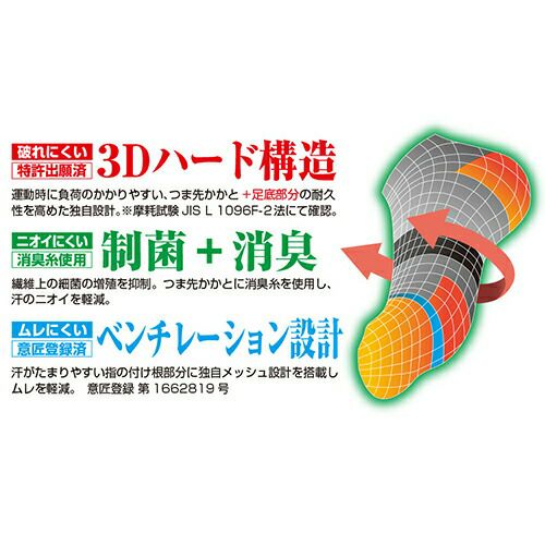 他の画像を見る 【メール便対応】靴下 岡本 10倍破れにくいソックス 制菌・消臭 5本指 ショート丈 3足組 カラーアソート 489-437-25-00、489-437-27-00 ソックスソックス 靴下 特別価格 ¥ 1,408 税込 糸からこだわった高耐久設計の10倍破れにくい5本指靴下! ◆耐久性:歩行時に負荷のかかりやすい、つま先、かかと、足底部分の耐久性を高めた独自設計(摩耗試験 JIS L 1096にて確認済)◆制菌消臭:つま先やかかとに消臭糸を使用し、繊維上の細菌の増殖を抑制することで汗のニオイを軽減します。◆メッシュ:汗がたまりやすい、指の付け根部分に独自メッシュ設計を搭載し、ムレを軽減します。 詳細を見る お気に入りに登録する