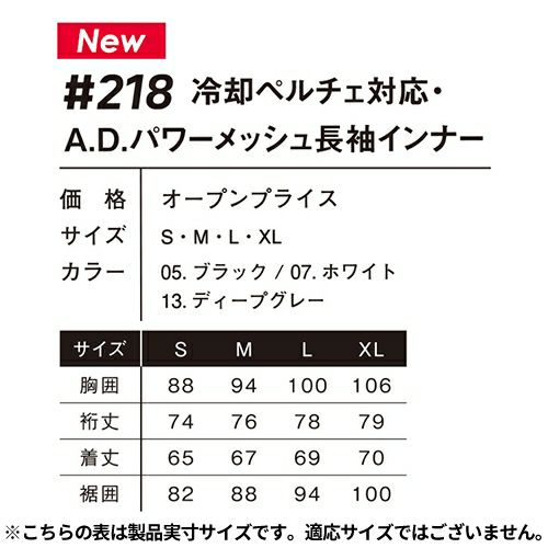 他の画像を見る [メール便対応]アイズフロンティア 夏用インナー 薄手 長袖 #218 メッシュ A.D. パワー メッシュ インナー メンズ 夏 接触冷感 UVカット 紫外線対策 日焼け対策 吸水 吸汗 速乾 I'Z FRONTIER アンダーシャツ 肌着 作業着 作業服 ゴルフ スポーツ コンプレッション 特別価格 ¥ 2,670 税込 弊社冷却ペルチェデバイス商品の機能を最大限に発揮される事を目的として開発された超爽快インナーウェアシャツ 脇、及び背面に、非常に薄く且つ隙間の多いパワーメッシュ素材を採用。一般基準を凌ぐ破裂強度(測定値352Kpa)を確保しつつ、限界まで爽快性を追求。より肌感覚に近い清涼感を発揮します。抗ピリング性 (5級)、抗スナッグ性 (4.5級)等高い強度も併せ持つ完成度の高い1着に仕上がっています。 詳細を見る お気に入りに登録する
