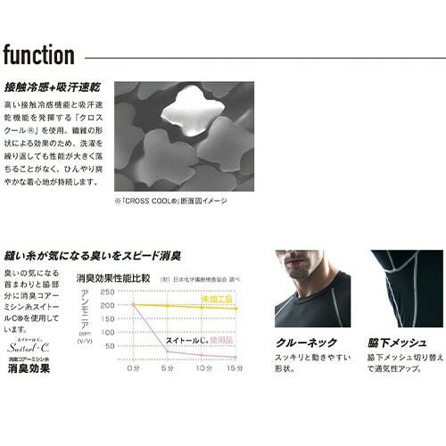 他の画像を見る アイズフロンティア 長袖 インナー 冷感・遮熱・消臭コンプレッションクルーネックシャツ #215 I'Z FRONTIER メンズ 夏 夏用インナー 接触冷感 UVカット 紫外線対策 日焼け対策 吸水 吸汗 速乾 アンダーシャツ 肌着 作業着 作業服 ゴルフ スポーツ コンプレッション 特別価格 ¥ 1,930 税込 夏場に求められる全ての機能を惜しみなく投入したハイスペックモデル。サマーコンプレッションここに極まる。 ・接触冷感性、遮熱性、吸水速乾性、伸長回復率等、サマーシーズンに求められる全ての機能をハイレベルに合わせ持つサマーコンプレッションハイスペックモデル・ナノレベルまで砕いた冷感鉱物を繊維内部に練りこむ事で、一般基準約1.7倍の冷感指数を実現しました。ハイレベルな接触冷感機能を誇ります。・ナノレベルのセラミック粉体を繊維内部に練りこむ事で、第三者研究機関測定値マイナス8.7℃を実現した驚異の遮熱機能を誇ります。・遮断率99.9%を誇るハイレベルなUVカット性能付です。・特殊製法の消臭糸を使用し、三大悪臭であるアンモニア、酢酸、イソ吉草酸に対して高い消臭効果を発揮します。・繊維の特殊加工により、素早い吸水、拡散、速乾性を併せ持ちます。・脇部分に冷感メッシュ素材を使用し更なる快適性を追求・伸縮率66.3%、伸長回復率95.1%を誇るハイレベルなストレッチ性を発揮 詳細を見る お気に入りに登録する