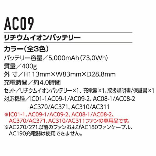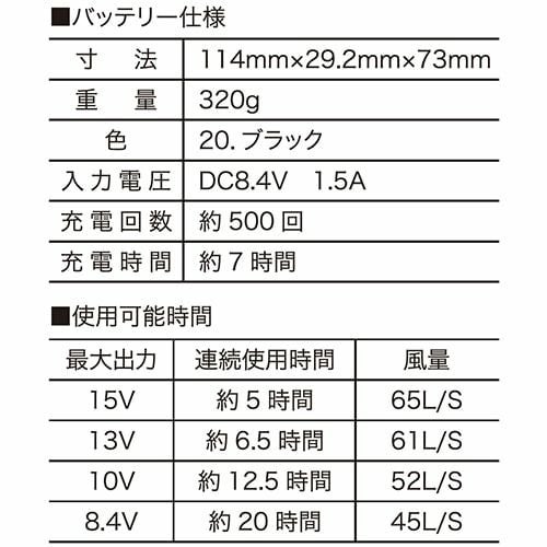 他の画像を見る EFウェア バッテリー クロダルマ AIR SENSOR KS-250シリーズ リチウムイオンバッテリー 2025年モデル KS-254 KS-254 作業着 作業服 春夏EFウェア バッテリー 特別価格 ¥ 9,800 税込 圧倒的に便利な洗える高風量106Lファンがついにクロダルマからも登場!! ■ファン(風量、連続稼働時間)弱:56L/s・約20時間、中:78L/s、約8.5時間、強:95L/s、約5時間、最強:106L/s、約8時間ファン質量(1個):88g■バッテリー出力弱:10V、中:14V、強:17V、最強:20V■充電式リチウムイオン電池(DC18.5V/3350mAh/61.97Wh)重量:約319g外形寸法:W75×D27×H115mm充電時間:約3.5時間充電回数:約500回定格入力:DC21V/1500mA 在庫切れ 再入荷お知らせ お気に入りに登録する