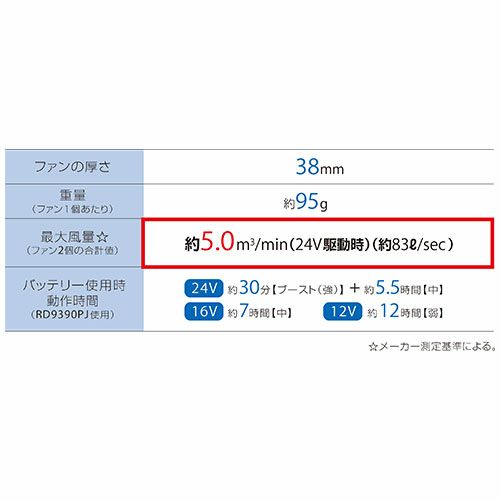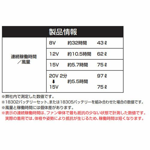他の画像を見る EFウェア ファン クロダルマ AIR SENSOR KS-250シリーズ ファン(2個)+丸洗い防水栓 2025年モデル KS-253 KS-253 作業着 作業服 春夏EFウェア ファン 特別価格 ¥ 5,800 税込 圧倒的に便利な洗える高風量106Lファンがついにクロダルマからも登場!! ■ファン(風量、連続稼働時間)弱:56L/s・約20時間、中:78L/s、約8.5時間、強:95L/s、約5時間、最強:106L/s、約8時間ファン質量(1個):88g■バッテリー出力弱:10V、中:14V、強:17V、最強:20V■充電式リチウムイオン電池(DC18.5V/3350mAh/61.97Wh)重量:約319g外形寸法:W75×D27×H115mm充電時間:約3.5時間充電回数:約500回定格入力:DC21V/1500mA カートに入れる お気に入りに登録する