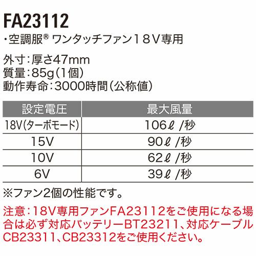 他の画像を見る EFウェア ファン 空調服 空調服 18V用ワンタッチファン 2個入り 2023年モデル FA23112 作業着 作業服 春夏EFウェア ファン 特別価格 ¥ 6,230 税込 最強ファンバッテリー。最大電圧18V、最大風量106L/秒 在庫切れ 詳細を見る お気に入りに登録する