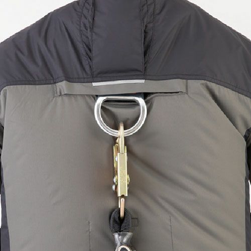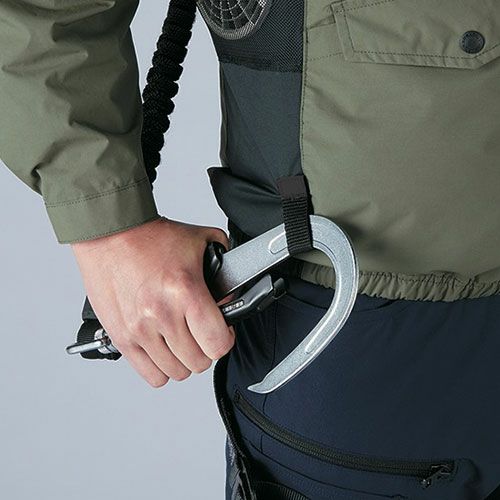 高所での安全な作業をサポートするハーネス対応 サイドファン仕様、ランヤード掛け・背ランヤード取出口、保冷剤ポケット装備