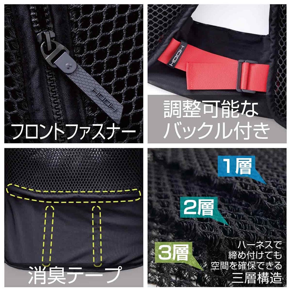 スペーサーの一部に特殊な三層構造を採用。ハーネスで締め付けても内部空間が潰れず、背中から首筋までスムーズに風が流れます。