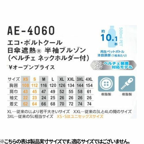 他の画像を見る EFウェア 半袖 コーコス信岡 CO-COS VOLT COOL エコ ボルトクール 日傘遮熱半袖ブルゾン(ペルチェネックホルダー付・ファン無し)2025年モデル AE-4060 作業着 作業服 春夏 電動ファン対応 ペルチェ対応 扇風機 ニアサイドファン 遮熱 酷暑 猛暑 熱中症対策 涼しい SDGs カーボンオフセット ペットボトル リサイクル 特別価格 ¥ 5,398 税込 SDGsに配慮したエコマーク&カーボン・オフセット対応裏アルミコーティングの「日傘遮熱」でマイナス11度を実現首元にペルチェクーラーも装着可能なハイブリッド空調ウェア ●日傘遮熱:裏アルミコーティングの「日傘遮熱」でマイナス11℃●エコ素材::再生PET素材100%のボトルテックで環境活動へ寄与●ニアサイドファン:脇マルチポケットを活かしながらが背中の邪魔になりにくい●ペルチェネックホルダー:首元ベルチェ装備可能●保冷剤ポケット:背中と両脇の3ヵ所の保冷剤ポケット付き●衿ワイヤー入り:形状記憶ワイヤー入りで風気路をつぶす首元に風を効率的に送ることが可能●エコプリント:ボトルテック・カーボンオフセット・エコマークのプリント入りで着用するだけで環境活動へ寄与 詳細を見る お気に入りに登録する