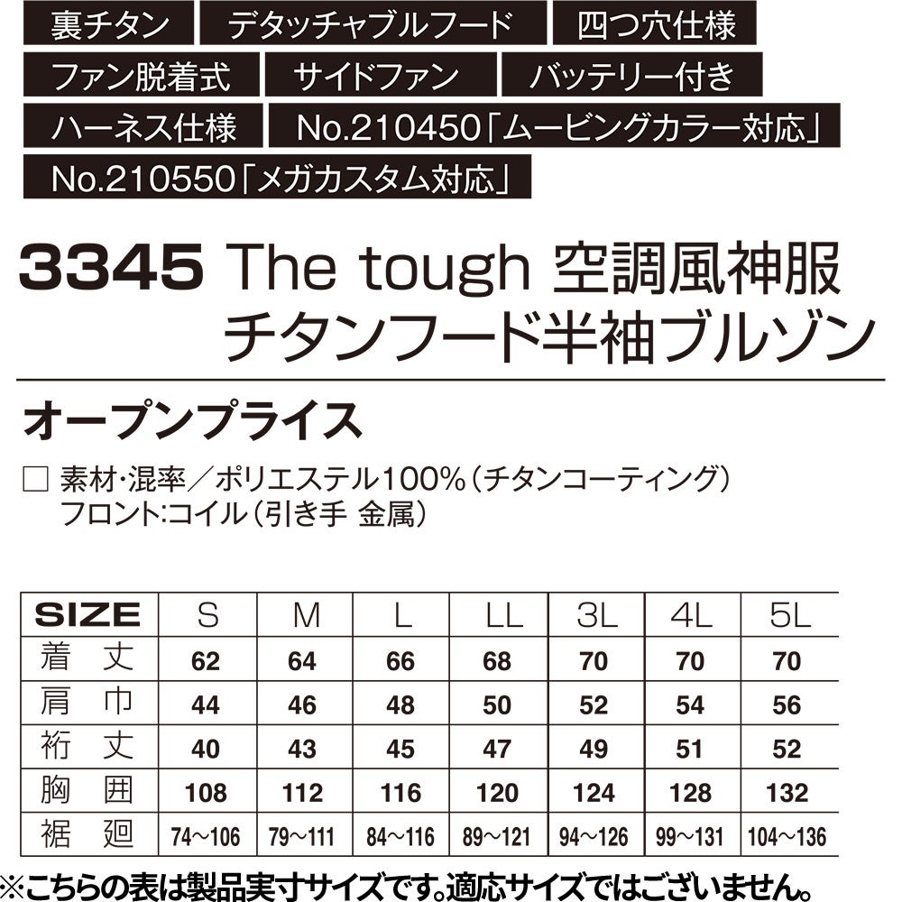 他の画像を見る EFウェア 半袖 アタックベース ATACK BASE 空調風神服 The tough チタンフード半袖ブルゾン(4つ穴・ファン・ペルチェ無し)ペルチェ対応 2026年度モデル 3345 作業着 作業服 春夏 電動ファン 扇風機 ミドルバックファン サイドファン 4ファン対応 猛暑 酷暑 熱中症対策 フルハーネス対応 特別価格 ¥ 5,165 税込 The toughから4つ穴ファン仕様の空調風神服が登場4つ穴ファン仕様に加えて、デタッチャブルフード、ハーネス対応、遮熱、ハイポジションファンの機能が搭載 ●別売りのアイスキーパーメガカスタムとアイスキーパームービングカラーを組み合わせることで最上級の涼しさを生み出す1着●極涼 MOST COOL -13.5℃ チタン遮熱効果●デタッチャブルフード:フードの取り外しが可能●ハイポジションファン:高めのファン位置で冷却効率をアップ●フルハーネス対応:背中からランヤードを取り出せるハーネス仕様●ペルチェデバイス対応背中:アイスキーパーメガカスタム(別売)に対応首:アイスキーパームービングカラー(別売)に対応●付属品(パーツ売り関連):着脱式カバー×2、着脱式ファンリング×4付属のカバーで2つ穴ファンにもできます。 在庫切れ 詳細を見る お気に入りに登録する