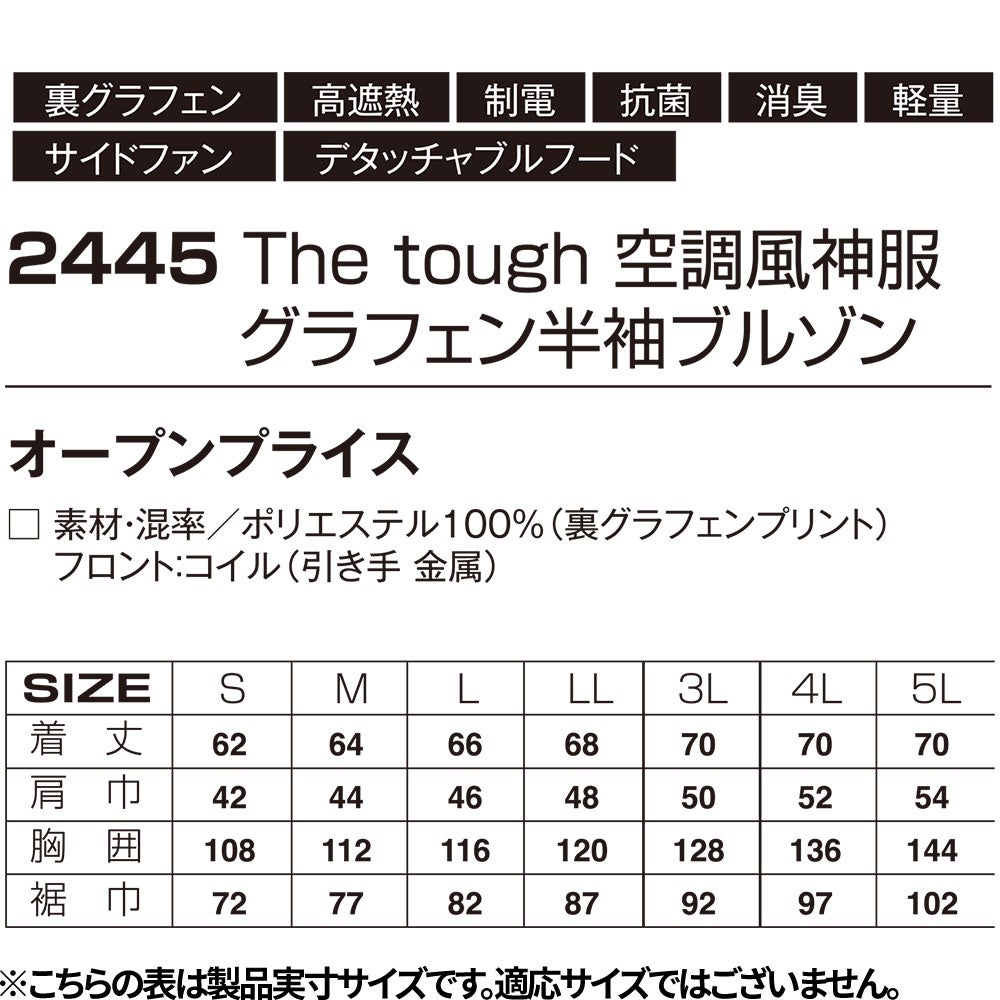 他の画像を見る EFウェア 半袖 アタックベース ATACK BASE 空調風神服 The tough グラフェン半袖ブルゾン(ファン無し)サイドファン仕様 2026年度モデル 2445 作業着 作業服 春夏 電動ファン 扇風機 猛暑 酷暑 熱中症対策 UVカット 制電 抗菌 消臭 フード付き シンプル 遮熱 涼しい 特別価格 ¥ 4,671 税込 高遮熱 グラフェンプリントをブロック MAX -14.5℃炭素素材のグラフェンが熱を遮り、快適な着心地を実現UV、制電、抗菌、消臭の機能を搭載した1着 ●GRAPHENE NANO TECHNOLOGY:高遮熱材「グラフェン」を裏面に採用●3D通気 -立体通気路-:背中側に立体的な通気路を確保。首筋を包み込み大容量の風が吹き抜けます。●サイドファン仕様:重機や車の運転時に邪魔になりにくい。●デタッチャブルフード:フードの取り外しが可能●マルチ機能:UVカット、制電、抗菌、消臭、軽量 在庫切れ 詳細を見る お気に入りに登録する
