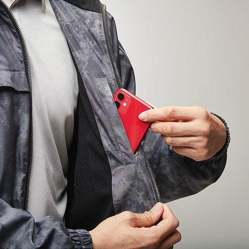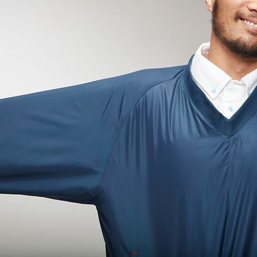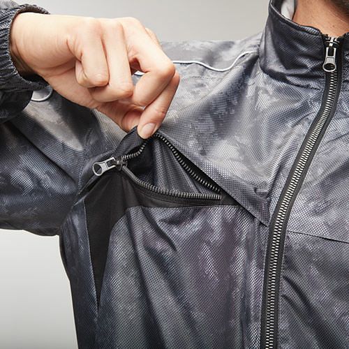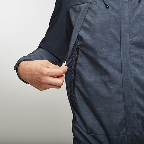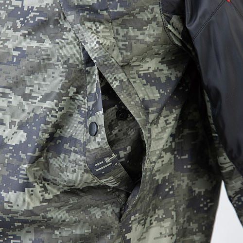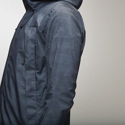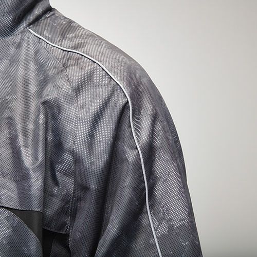高ストレッチ「4Dmotion」とドライ&蓄熱素材のハイブリッド 前身頃と袖上部に耐水圧、防水性に優れた素材を使用後見頃上部・脇廻り・袖下は伸びる布帛で動きやすさをUPしパフォーマンスを向上後見頃下部と脇下は微熱・ドライ素材で余分な蒸れを防ぐ