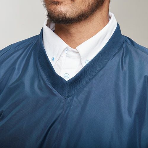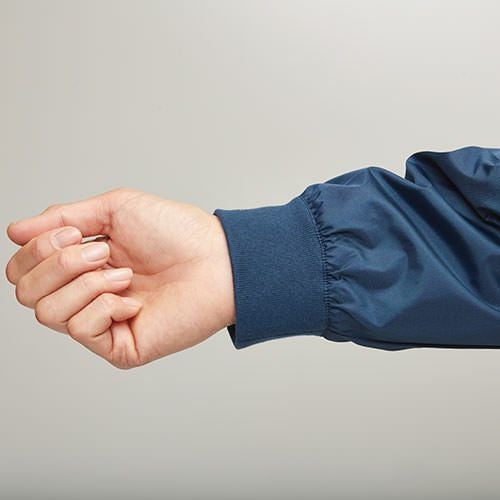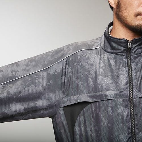 黒がポイントのデザインでパンツとセットアップも可能なウィンドブレーカー 生地は軽量撥水ストレッチマイクロタフタにストレッチフイルムボンディングした2層で蒸れを防ぐ脇パーツは黒ニット、ウインドブレーカーパンツとのセットUPもオシャレに。