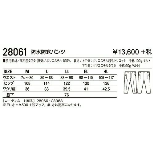 他の画像を見る 自重堂 パンツ 防寒パンツ ワークパンツ 防寒 ズボン 保温 人気 安い 防寒着 おしゃれ 暖かい 秋冬用 最強 かっこいい 作業着 おすすめ ワーク マン メンズ カジュアル 定番 寒さ対策 防寒ウェア 屋外作業 屋内作業 あったか シンプル 28061 特別価格 ¥ 8,569 税込 〜 特別価格 ¥ 税込 雨、雪、風、寒さ。悪天候からワーカーを守る。 ハードワーカーが求める、防水、透湿性を極限まで追求しました。 雨や雪、そして風や寒さなど、悪天候のなかで優れたパフォーマンスを発揮する高機能防寒ウエア。 詳細を見る お気に入りに登録する