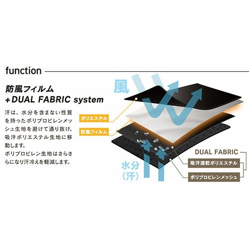 水分を吸わない性質をもったポリプロピレンを避けてメッシュ部分から外側の吸汗ポリエステル生地に汗を移動し閉じ込めます。