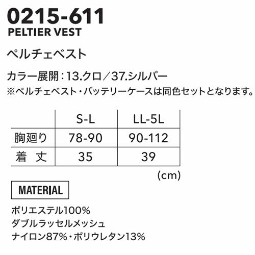 他の画像を見る アイズフロンティア ペルチェベスト 服のみ ペルチェアウターベスト 単品 冷却作業着 I'Z FRONTIER #106 作業着 作業服 春夏 動きやすい 空調 服 フルハーネス対応 接触冷感 冷たい ストレッチ 特別価格 ¥ 5,460 税込 背面両脇の計4ヶ所に直径5cmのペルチェデバイスが装着可能なニュータイプ冷却ウェア。デバイス接触部位は電源を入れ約10秒で現境温度より最大マイナス約22℃のハイレベルな冷却機能を発揮! 高性能なナイロンサマーストレッチに特殊なレーザー加工技術を駆使し通気孔を発現させ、業界トップクラスの通気性を実現したSSシーズン専用素材を本体に採用。真夏のワークシーンに遺憾なくその真価を発揮します。強靭なナイロン糸を使用し、一般基準の2倍以上(タテ約56N、ヨコ約21N) の引裂き強度を誇ります。 詳細を見る お気に入りに登録する