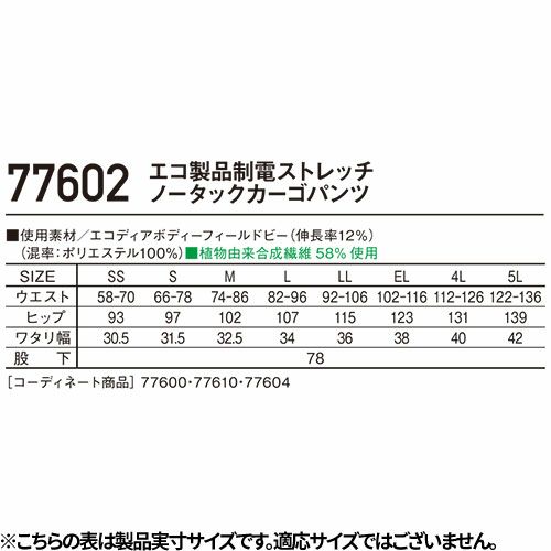 他の画像を見る 作業着 作業服 カーゴパンツ 春夏 Z-DRAGON GREEN エコ製品制電ストレッチノータックカーゴパンツ 77602 作業着 春夏 SDGs エコロジカル 環境配慮型 植物由来 エコマーク グリーン購入法対応 帯電防止 男女兼用 シャープなスタイル スタイリッシュ カジュアル 特別価格 ¥ 3,283 税込 〜 特別価格 ¥ 税込 SDGsに貢献する環境配慮型カジュアルワークウェア「Z-DORAGO GREEN」SDGsに対応したエコロジカルなプロダクト驚きの軽量感とストレッチ機能で快適な着用感を実現 ●SDGsを考慮した植物由来繊維58%素材を使用●エコマーク&グリーン購入法対応商品●表素材だけでなく付属にも環境配慮型素材を使用●優れた帯電防止性を備えるJIS T81118適合商品 詳細を見る お気に入りに登録する