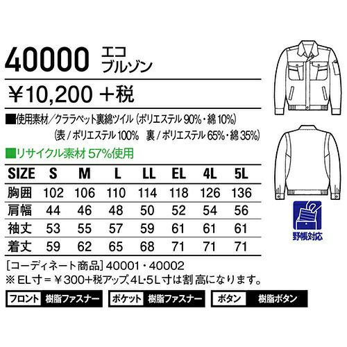他の画像を見る 自重堂 DESK 作業服 924 長袖ブルゾン 春夏 メンズ 作業着 ワークウエア ブルゾン 特別価格 ¥ 7,260 税込 〜 特別価格 ¥ 税込 チリやホコリを嫌う職場に低発塵ユニフォーム。 低発塵性と肌触りの良さを追求した二重織り素材「リバーセル」を使用。 毛羽が発生しにくいポリエステル長繊維を使用することで低発塵性に優れ、 またウォッシュ&ケアにも富んでいます。 詳細を見る お気に入りに登録する