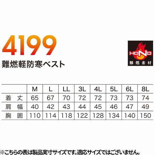 他の画像を見る 防寒ベスト 村上被服 鳳皇 HOOH 難燃軽防寒ベスト 4199 作業着 防寒 作業服 綿100% 燃えにくい 耐炎 耐熱 制電 保温 溶接 鋳造 製鉄 消防 化学プラント ガソリンスタンド 火 職人 タフ 丈夫 機能性 シンプル カッコいい 粋 現場 アウトドア キャンプ 特別価格 ¥ 8,654 税込 〜 特別価格 ¥ 税込 火を扱う作業に!HONO難燃加工綿100%で作られた、耐炎・耐熱・制電性に優れた素材を使用した難燃ウェア 接炎しても燃え上がることなく炭化します。強くて肌触りの良い素材です。制電性を備え肌にまとわりつかない着心地です。素材だけでなく、機能的にも防炎性を高めています。耐炎・耐熱・耐電防止・保湿裏アルミ 在庫切れ 詳細を見る お気に入りに登録する