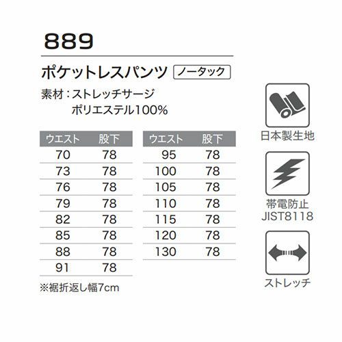 他の画像を見る 作業服 パンツ スラックス Asahicho 旭蝶繊維 ポケットレスパンツ 889 作業着 通年 秋冬作業着 作業服 ワークパンツ ズボン おしゃれ かっこいい オフィス ユニホーム 作業 軽作業 外作業 工場 現場 大きいサイズ 3L 4L 5L 6L 特別価格 ¥ 3,380 税込 〜 特別価格 ¥ 税込 全てのポケットが無いから異物混入を防げる! 洗濯耐久性とストレッチ性を兼ね備えたポケットレスシリーズ 在庫切れ 詳細を見る お気に入りに登録する