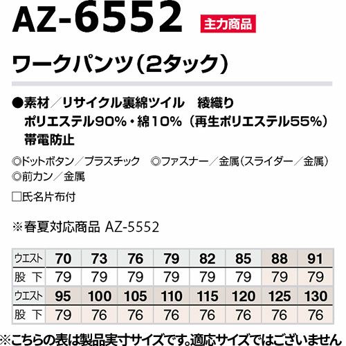 他の画像を見る アイトス AZ-5552 ワークパンツ(2タック ツータック) AITOZ 作業服 作業着 腿ポケット無 ボトムス スラックス パンツ ズボン メンズ レディース 男女兼用 春夏 帯電防止 ストレッチ 特別価格 ¥ 4,420 税込 〜 特別価格 ¥ 税込 清涼感を大切にした着心地抜群のワークウェア。 詳細を見る お気に入りに登録する