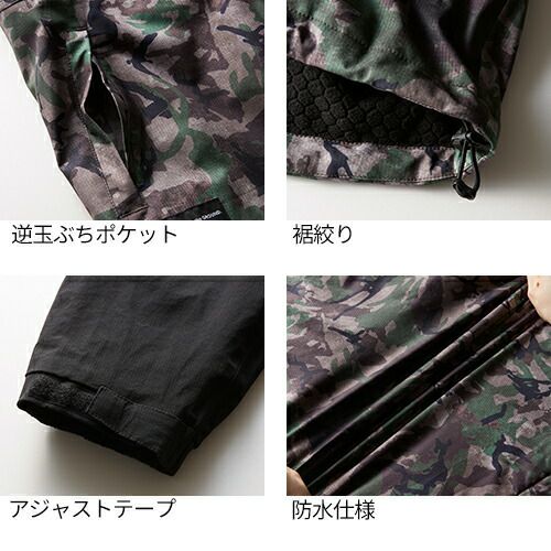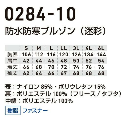 他の画像を見る 作業服 ブルゾン 桑和 SOWA ストレッチ防水防寒ブルゾン(迷彩) 0284-10 作業着 通年 秋冬作業着 作業服 ブルゾン 上着 おしゃれ かっこいい 人気 企業 法人 ワーク 作業 工場 外作業 ワークユニフォーム 仕事 土木 工事 特別価格 ¥ 8,740 税込 〜 特別価格 ¥ 税込 高い耐水性・透湿性・防寒性とストレッチ性・軽さを兼ね備えたハイスペックウェア ・防寒なのに動きやすい縦横ストレッチ生地を使用・裏地の部分ニット仕様でストレッチ性アップ・冷気の浸入を防ぐ防風性素材・多少の雨、水をはじきやすい・雨、水の浸入を防ぐ防水仕様・反射プリント使いによる高視認性・衣服内が蒸れにくい透湿性素材 詳細を見る お気に入りに登録する