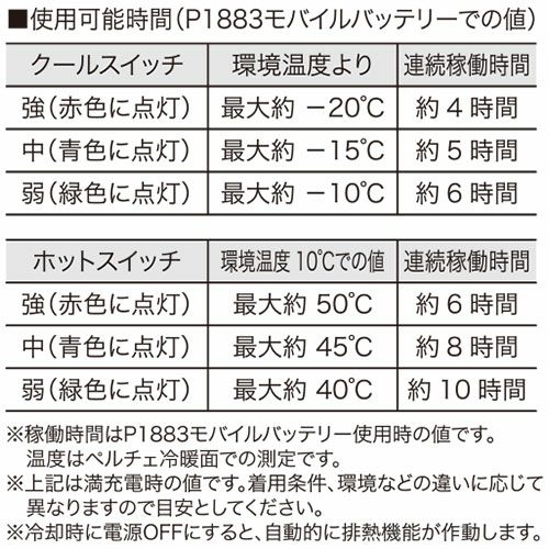 ・ペルチェデバイスは冷却時にファン部分から若干の排熱があります。デバイスの排熱を妨げるような着用はお避けください。