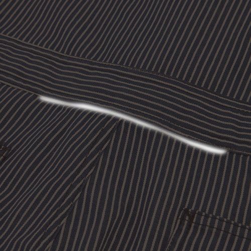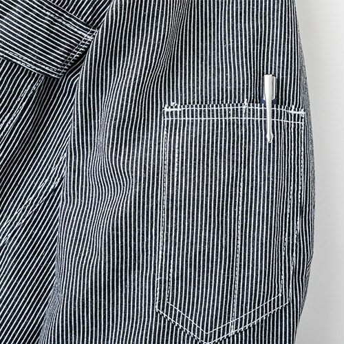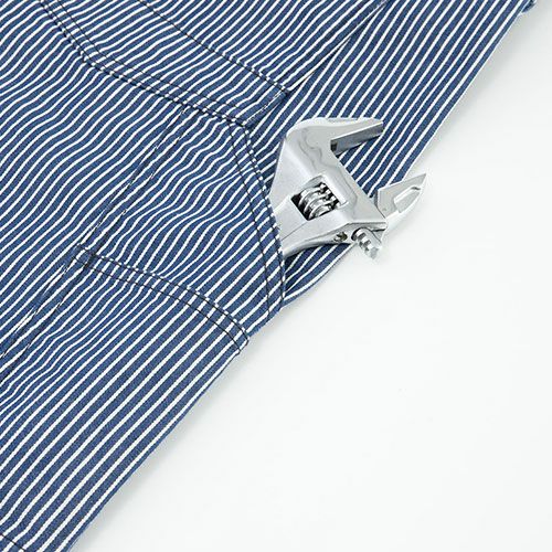 特徴的な綿麻素材のストライプ柄を細目に調整。緩すぎないシルエット。スマートフォン等の小物が収納しやすい胸ポケット。シンプルな印象とワークシーンの実用性を追求した最新作の綿麻ストライプつなぎ。