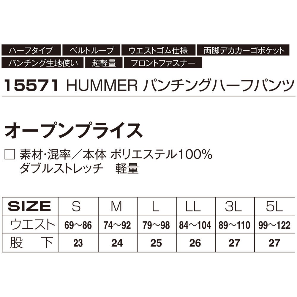 他の画像を見る 作業服 ハーフパンツ HUMMER ハマー パンチングハーフパンツ 15571 作業着 春夏 軽量 涼しい タウンユース アウトドア スポーツ 登山 トレッキング キャップ バーベキュー 釣り フィッシング サイクリング 特別価格 ¥ 2,992 税込 〜 特別価格 ¥ 税込 通気性を兼ね備えた猛暑の中、頑張る人のためのハーフパンツが登場パンチングが導く圧倒的な通気性が猛暑の現場でのパフォーマンスを底上げする。 在庫切れ 詳細を見る お気に入りに登録する
