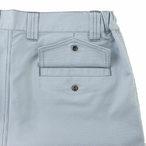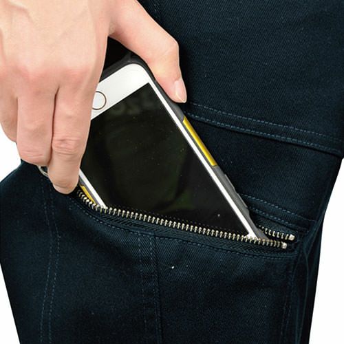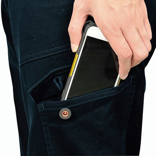 ストレッチ性を付与した制電対応綿素材 ストレッチ素材を活かし、定番スタイルながら野暮ったさを払拭、制電糸を使用し、大型ポケットを設けることで多様な用途に対応