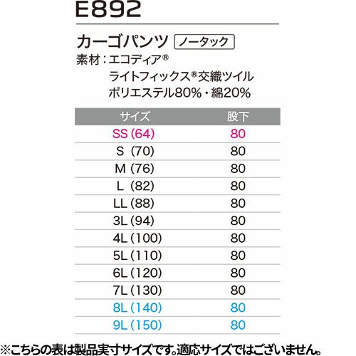 作業服 カーゴパンツ Asahicho 旭蝶繊維 カーゴパンツ(ノータック) E892 作業着 通年 秋冬 エコ 環境配慮 JIS T8118 帯電防止 ストレッチ 反射材 キングサイズ 大きいサイズ 男女共有 傷つけ防止 制服 会社 企業 工場 倉庫 配送 運送 建築 建設 土木 工事