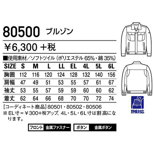 自重堂 作業服 80500 ブルゾン 秋冬 ユニセックス 作業着 ワークウエア 通年 上着 おしゃれ かっこいい 人気 企業 法人 ワーク 作業 工場 外作業 ワークユニフォーム 仕事 土木 工事 現場