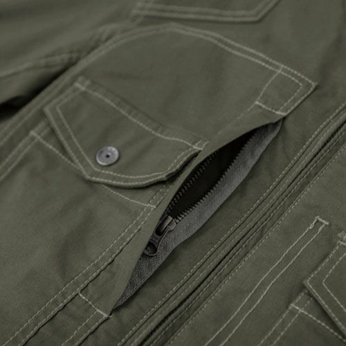 洗い加工を施した生地はユーズド感がありながらも、ドビー織の凹凸感でハードな印象を与えます。ポリウレタン糸の入ったのびのびストレッチとやわらかい風合いで着用時の窮屈感を軽減します。