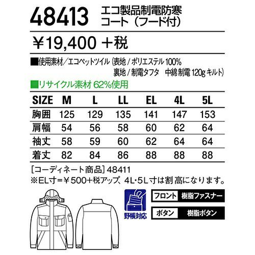 多機能トリプルバリューシリーズに冬場の静電気対策防寒ウエアが登場。 製品制電「JIST8118対応」+ 反射テープ「夜間の視認性アップ」の安全対策エコ防寒。反射テープ付きで夜間の視認性がさらにアップ。安全な作業をしっかりサポートします。