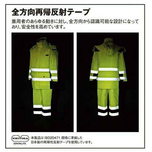 高視認性安全服の規格 ISO20471 JIS T 8127 に準拠したシリーズ。 薄暮や夜間作業時の視認性を高めることで。着用者の安全性を考慮した一着。蛍光素材と再帰反射テープを使用した高視認性防水防寒。【全方向再帰反射テープ】 本製品はISO20471 規格 に準拠した日本製の再帰性反射テープを使用しています。着用者のあらゆる動きに対し、全方向から認識可能な設計になっており、安全性を高めています。