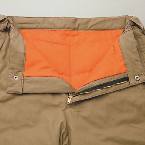 冬に負けない。自分に負けない。 裏地に保温性の高いアルミプリント、中綿に軽くて温かい高機能素材採用。耐水性にも優れた防水防寒のための必須アイテム、新登場。重ね着した中のズボンのポケットに手が届くスルーポケットを装備。