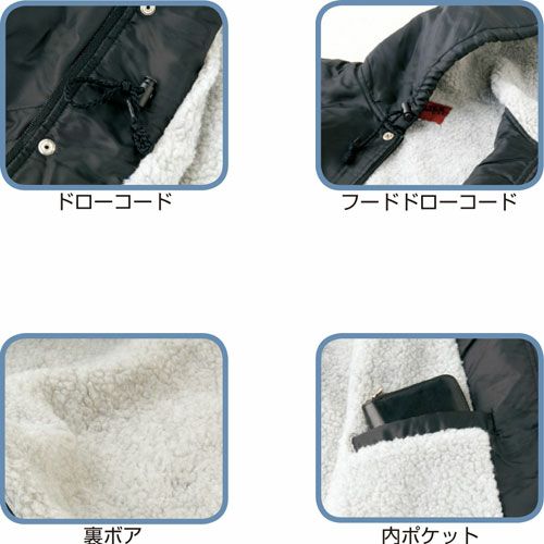 ナイロン100%だから、雨を弾き風を遮る。 裏ボアが温かいコートタイプの定番防寒ウエアです。 素材には撥水加工を施した「ナイロン100%ツイル」を使用し、冷たい雨からワーカーを温かく守ります。 衿ボアを取り外して着用することができます。