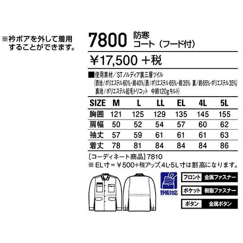 自重堂 コート(フード付) 防寒コート 防寒ジャケット 保温 人気 安い 最強 アウター ブルゾン ドカジャン 防寒ジャンパー ダウン 上着 防寒着 おしゃれ 暖かい 秋冬 かっこいい 作業着 ワーク マン メンズ 極寒 寒冷地 釣り キャンプ 登山 アウトドア 7800