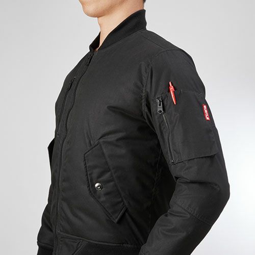 定番フライトJKTをタフなワーク仕様に!!優れた防風・保温性とパワフルな耐久性を発揮! 耐久性のあるT/Cタッサー素材を使用PAコーティングによる優れた防風性裏地アルミフィルムラミネートによる優れた保温性