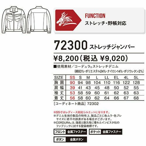 デニムジャケット 自重堂 Z-DRAGON ジージャン ストレッチ おしゃれ 人気 安い かっこいい おすすめ 作業着 作業服 Gジャン ジーンズ メンズ レディース コーデュラストレッチデニム 上着 ブルゾン ジャンパー アウター 通年 72300