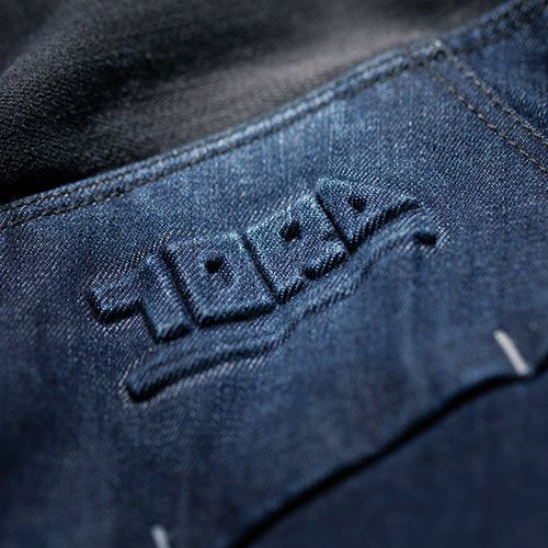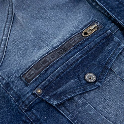 強度・伸縮性・デザイン性ともに優れた注目のデニム8840シリーズ 伸縮性の高いストレッチデニム【ラバーフレックス(R)】を取材に採用さらに摩擦の発生が多い部分には黒のコーデュラ(R)を配し強度アップと切替デザインを生み出しました。