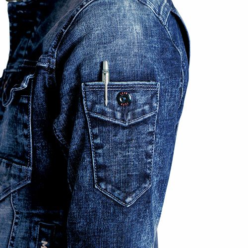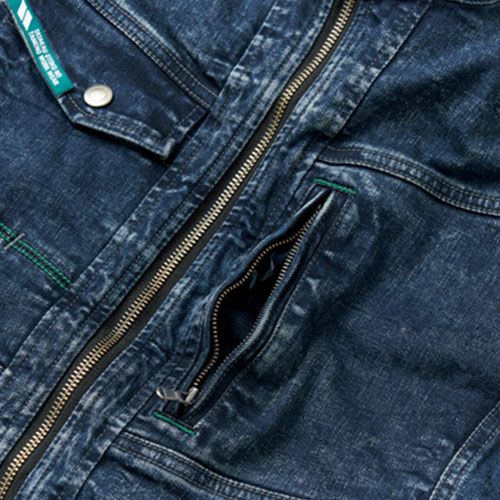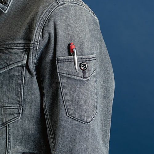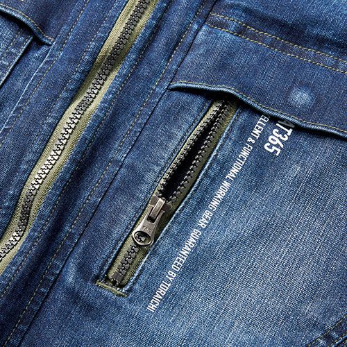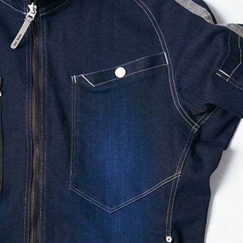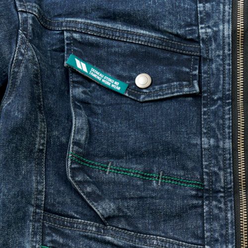 現場服シリーズにストレッチデニムシリーズが登場!ブラスト加工、バイオ加工、トッピングを施した深い味わい!! 白系ステッチや右胸のマットファスナーがアクセントになったオシャレなデニム現場服です。少しシャープなシルエットでもストレッチが効いているのでラクに作業が出来ます。