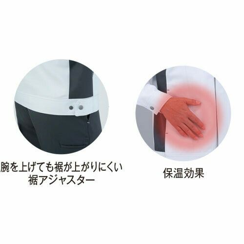 激ラク。驚異の動きやすさ。快適ストレッチ 素材に伸縮性のあるポリウレタンを配合し高いストレッチ性を実現。体の動きに合わせて生地が伸び縮みするため作業時のストレスを軽減し快適な着心地でワークライフをサポート