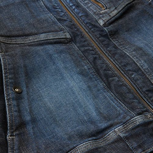 カジュアルとワイルドが一体化するストレッチデニム素材のライダース風ワークウェアワンウォッシュ+部分ブラストがアクセントになってよりワイルドな着こなしを可能に
